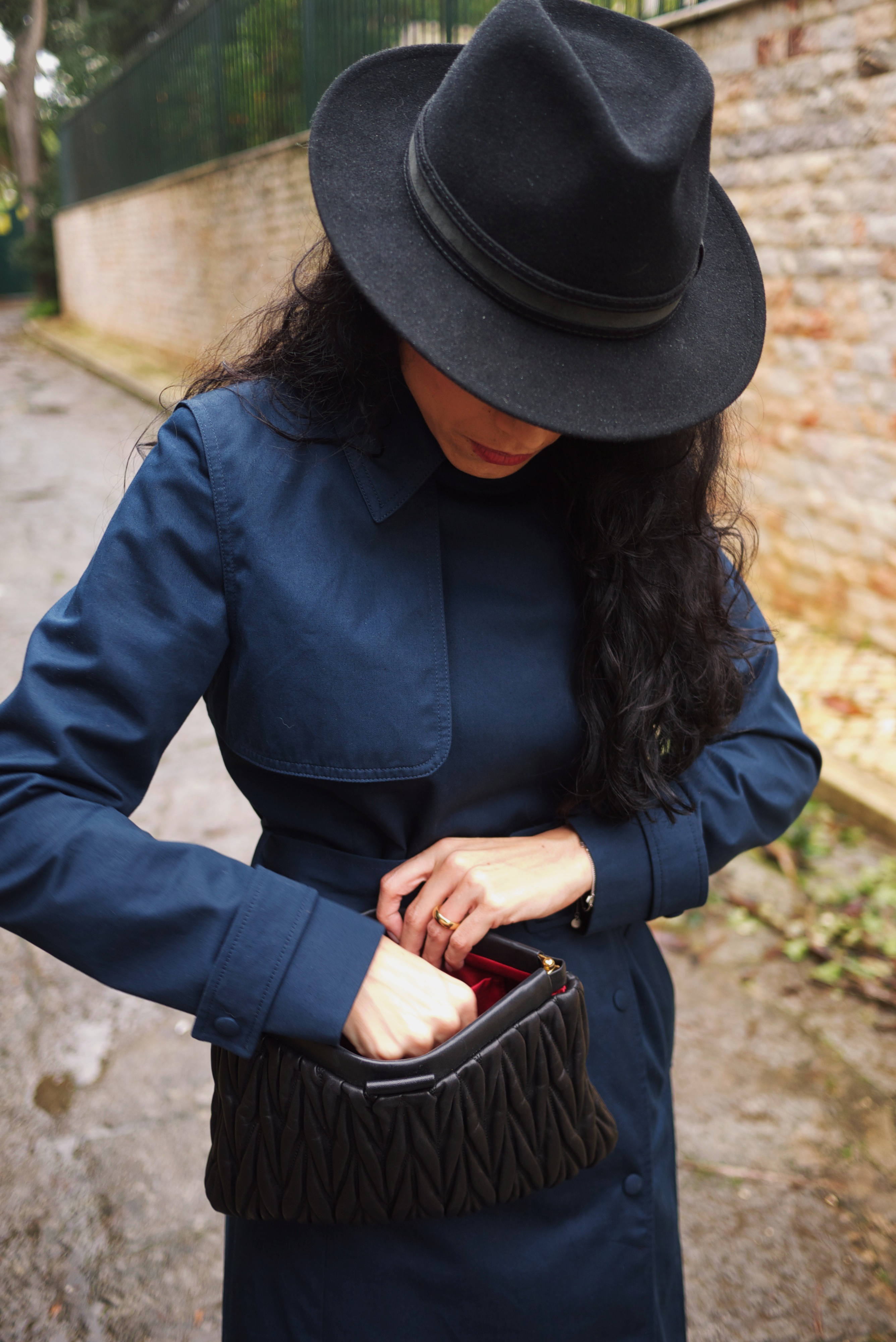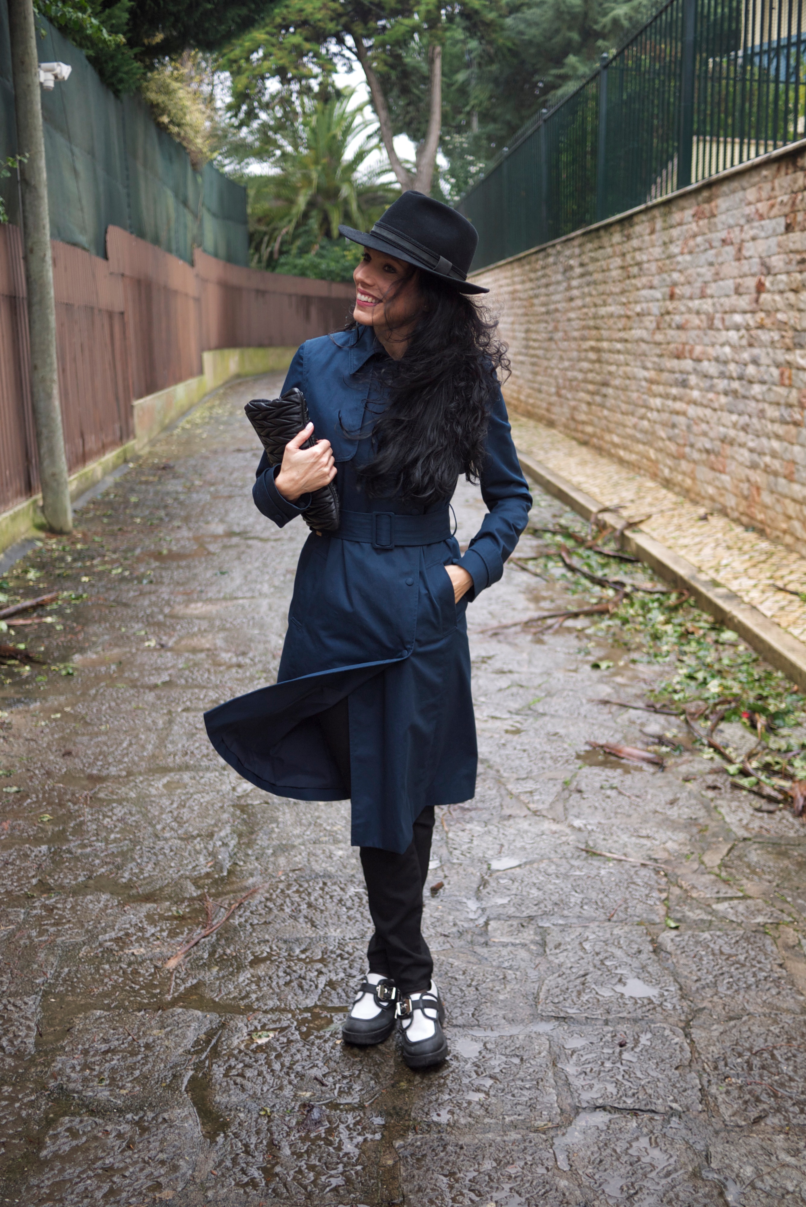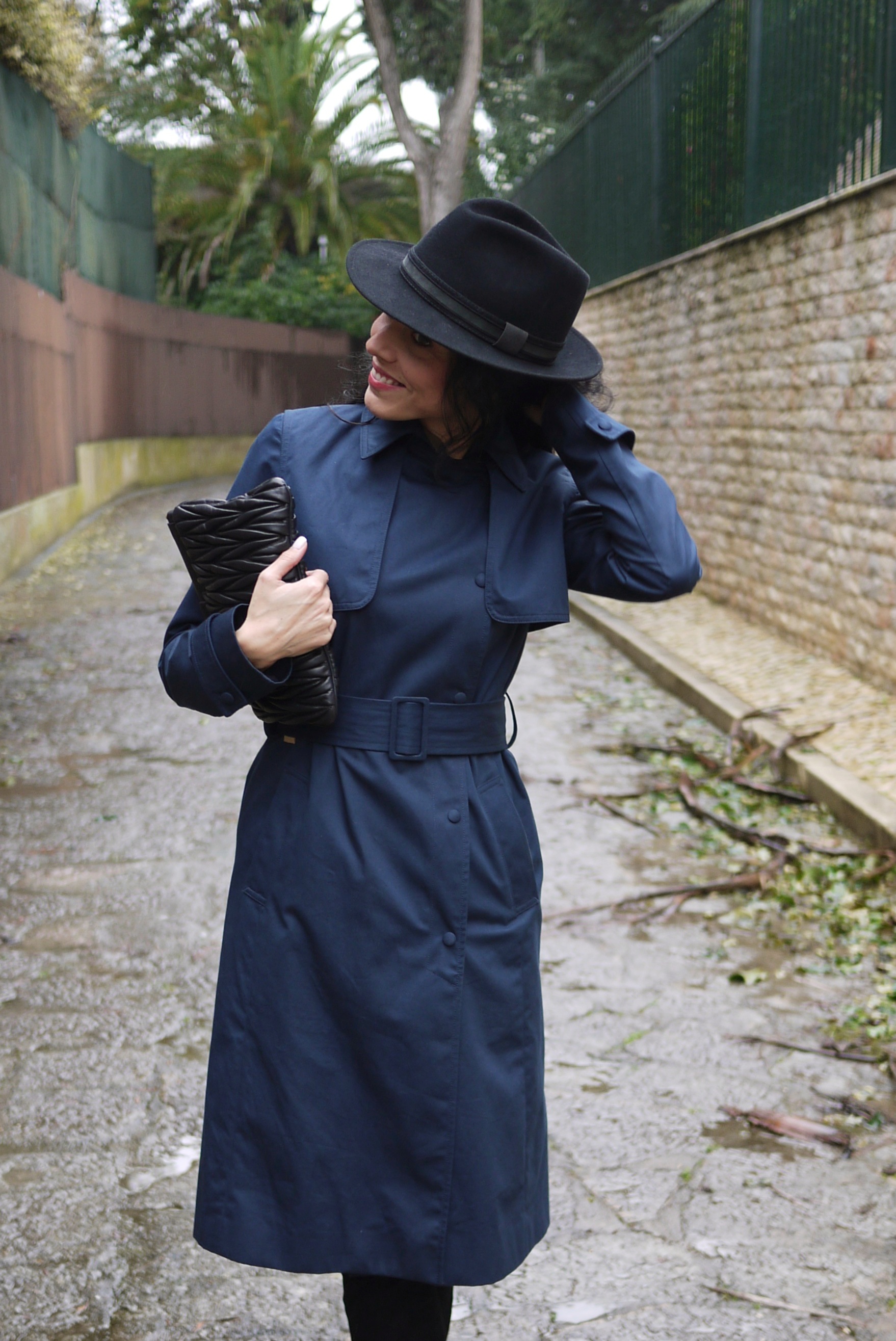 Trench coat: Lacoste; Calças: J Brand; Sapatos: Jeffrey Campbell; Clutch: Miu Miu; Chapéu: El Corte Inglês (secção homem)