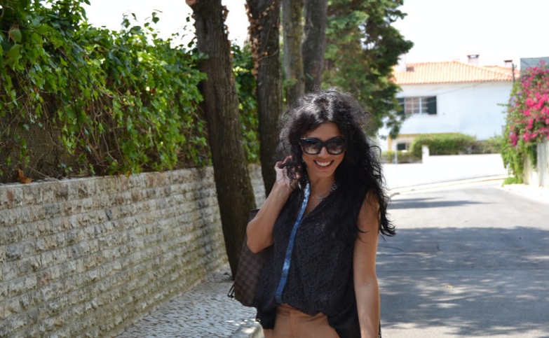 Camisa: Urban Outfitters ; Bermudas: Zara; Sandálias: Topshop 2012; Saco: Louis Vuitton – Nerverfull; Óculos: Marc Jacobs: Pulseiras: Loewe e lembranças de viagens.