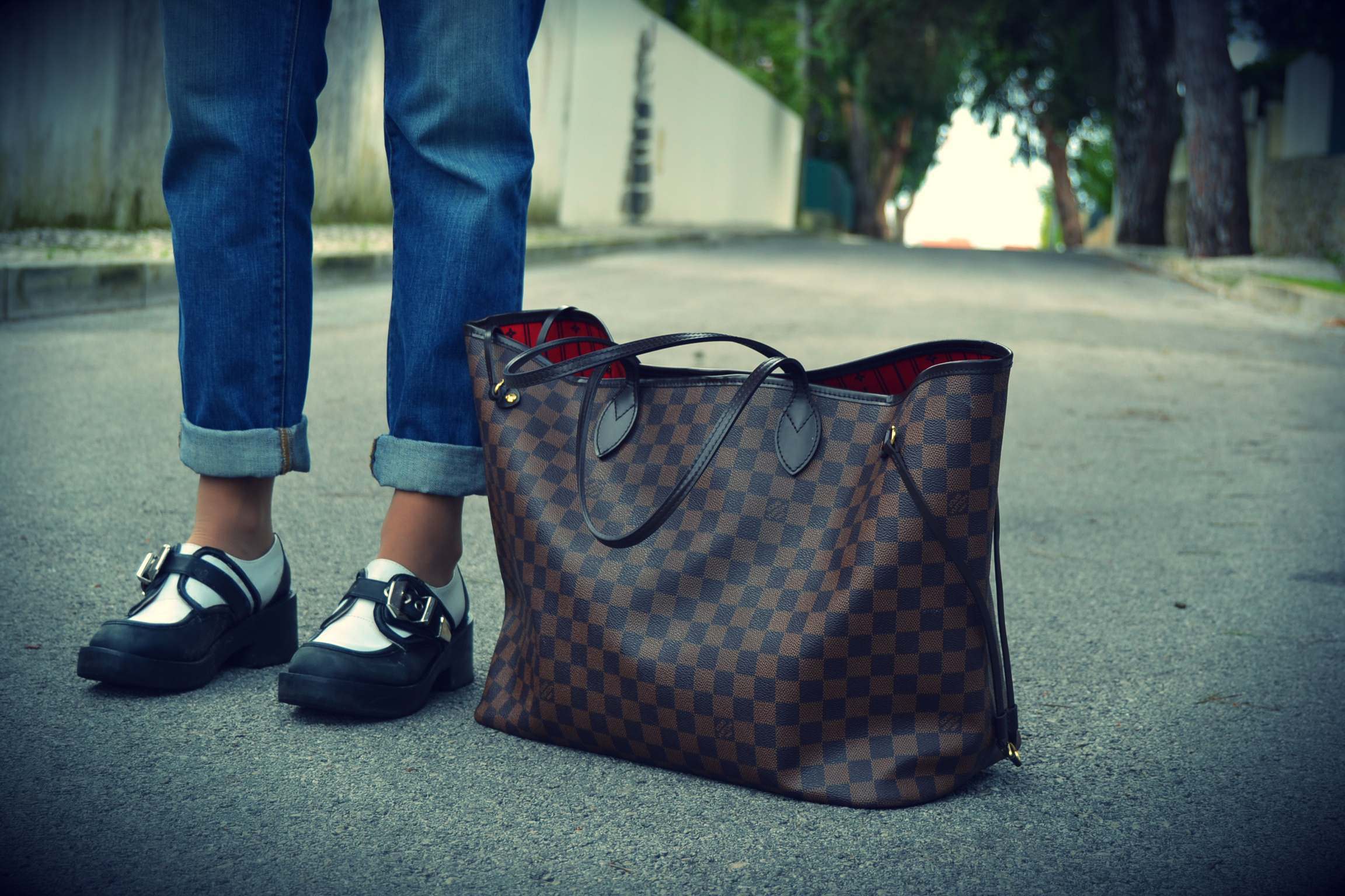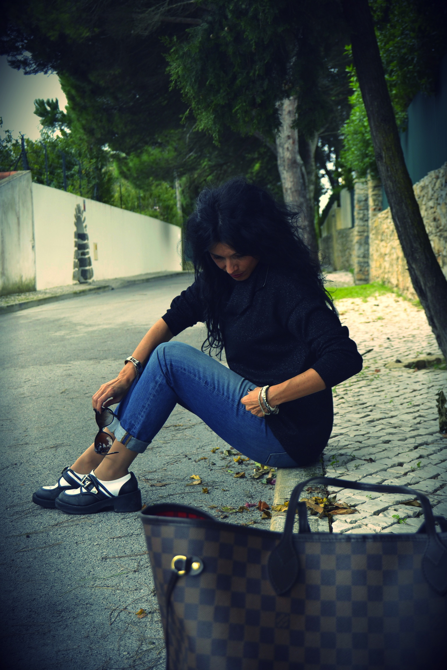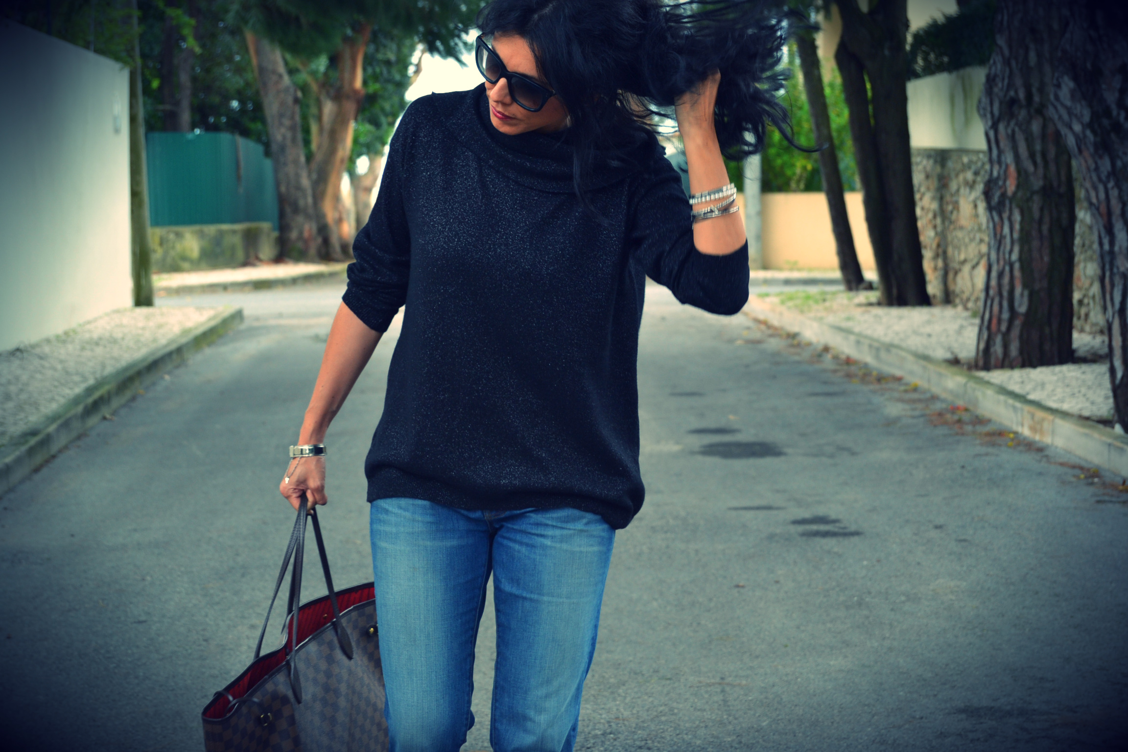 Camisola: Henry Cotton´s na loja Carias; Jeans: J Brand; Sapatos: Jeffrey Campbell; Louis Vuitton Nerverfull