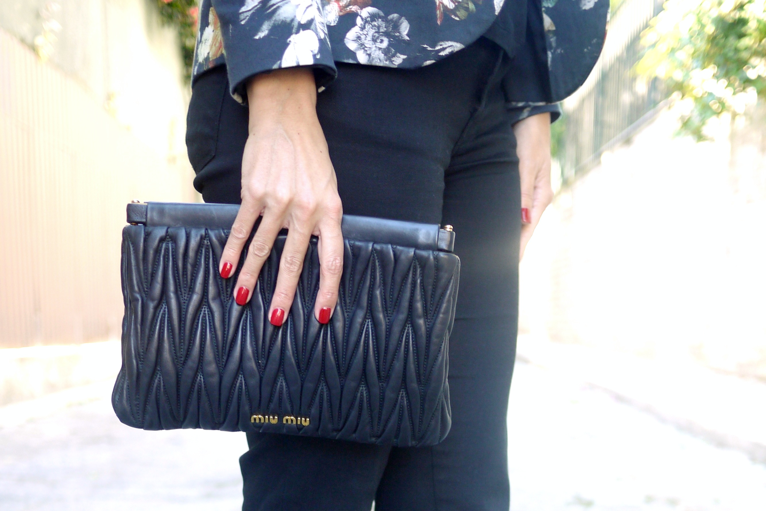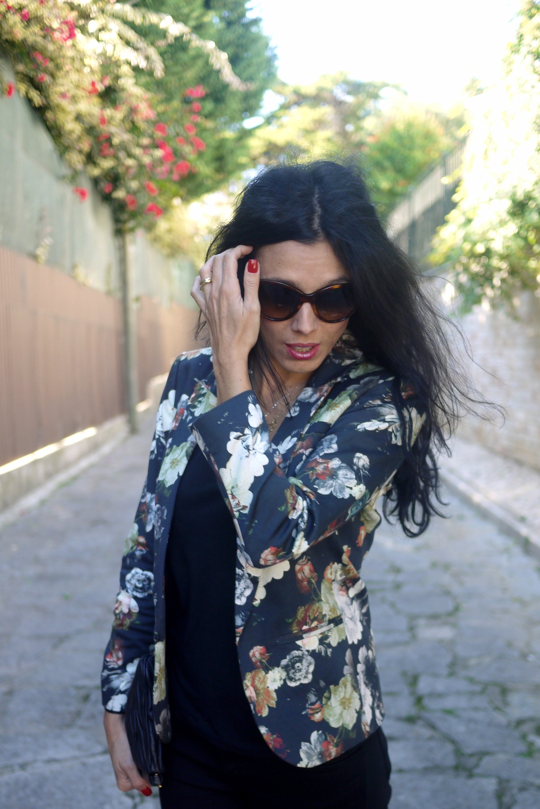Blazer: Topshop; T-shirt: Zara; Calças: J Brand; Clutch: miu miu; Sapatos: Marni; Óculos: Prada
