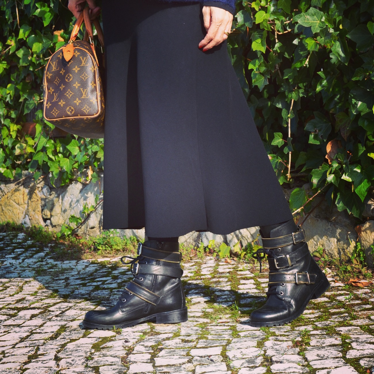 Camisola e saia: Zara; Botas: Maje; Mala: Speedy by louis Vuitton; Óculos: Marc Jacobs